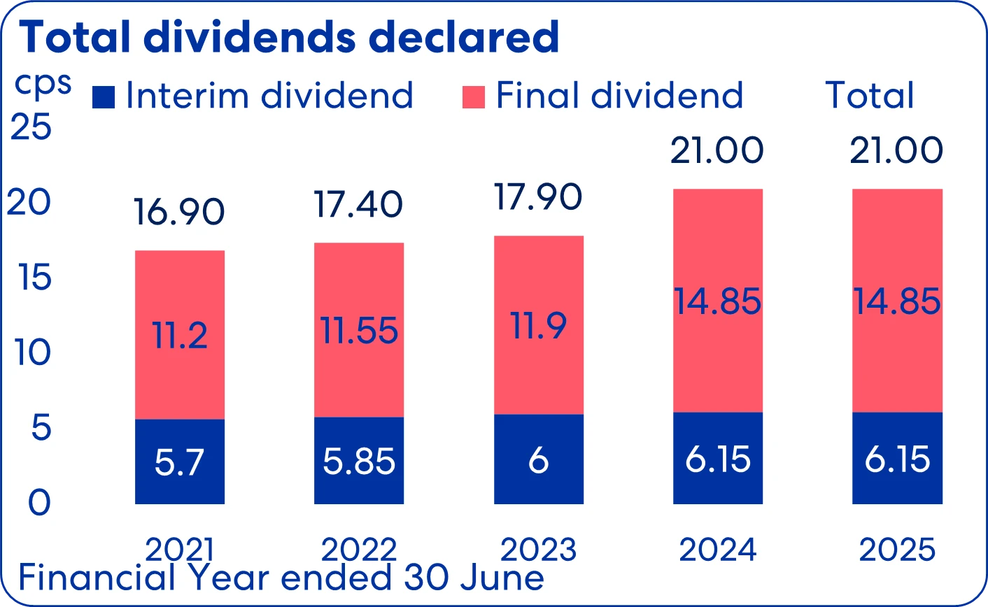 Final dividend of 14.85 cents per share, 73% imputed, to be paid on 23 September 2025