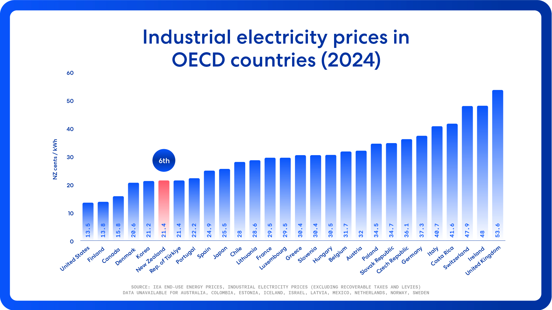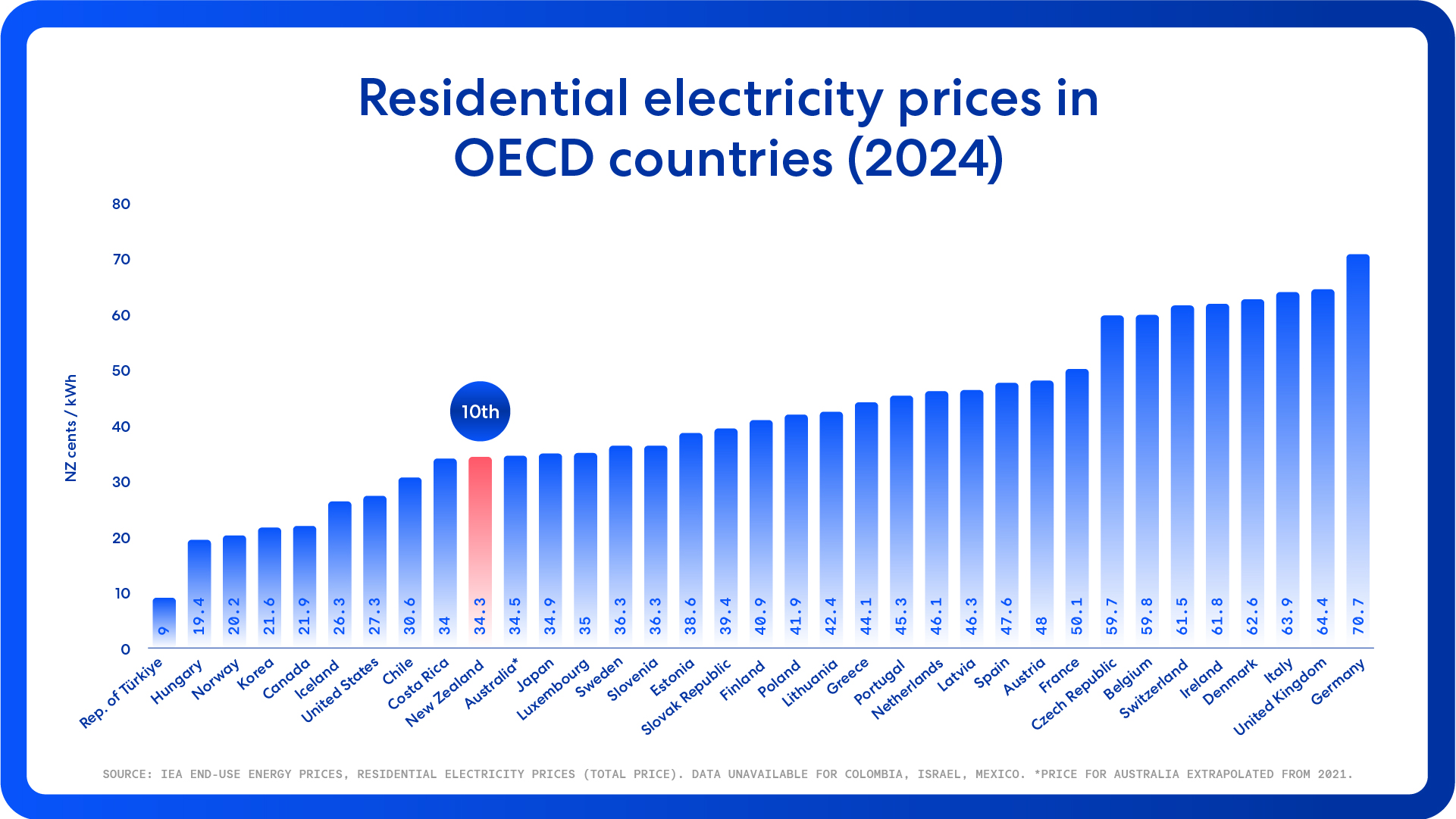 The graphs below present the most recent data collected and published by the International Energy Agency (IEA) on residential and industrial electricity prices in OECD countries. The figures show prices including tax – and for some countries will include Government subsidies which make the cost of electricity cheaper for the end consumer. New Zealand is ranked tenth cheapest for residential prices, and sixth cheapest for industrial prices.