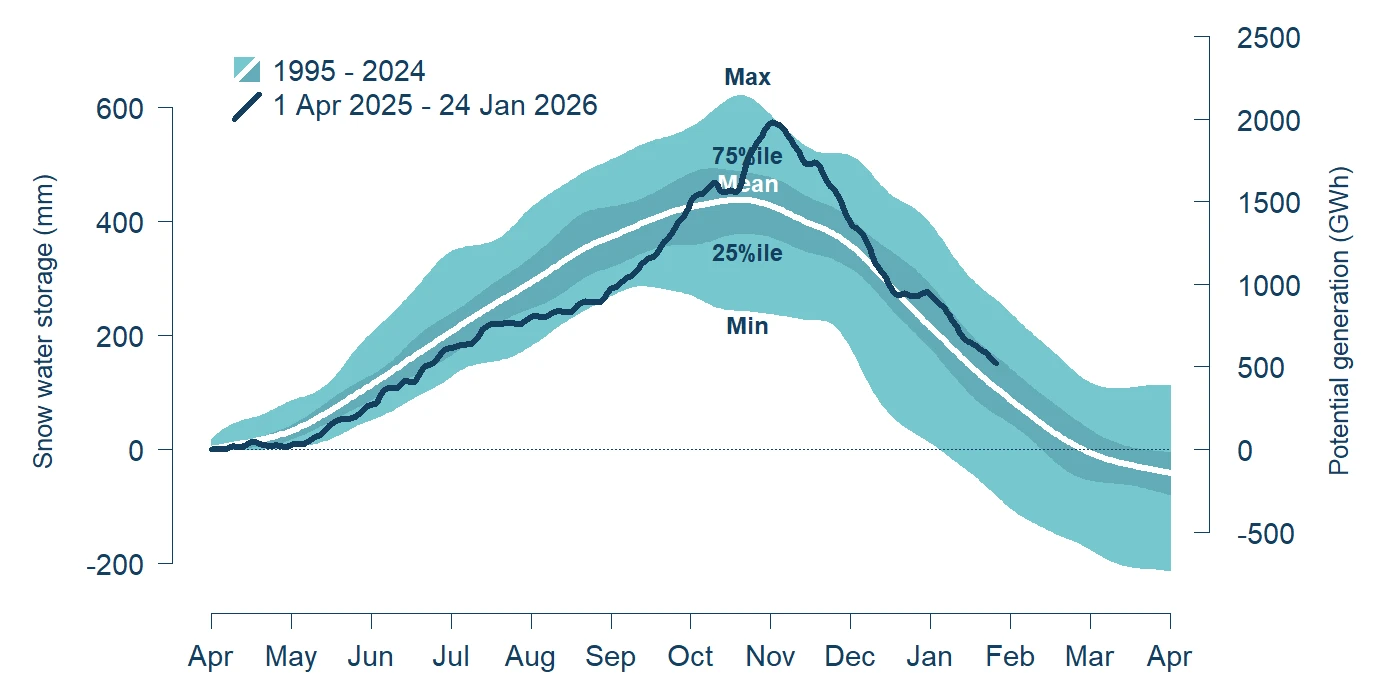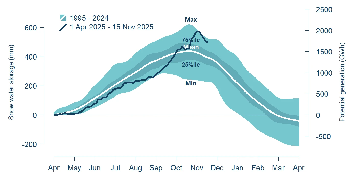 Calculating snow water equivalent (SWE) is complex and resulting estimates (and their relationship to lake inflows) have a high degree of uncertainty. Reliance should not be placed on the accuracy or completeness of the estimates provided and you should not use this information for investment or trading purposes. Meridian publishes a monthly operating report on the NZX and ASX outlining the current hydro storage position each month.